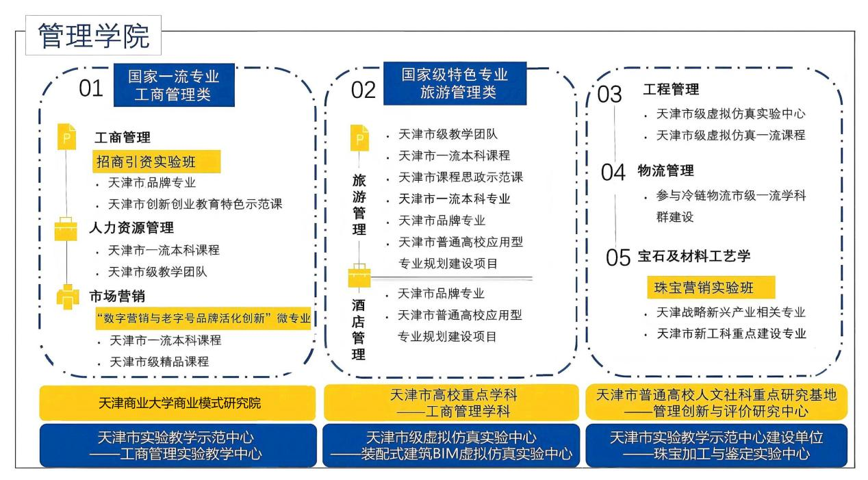 工商管理学一级学科为天津市重点学科,工商管理类为国家级一流本科专业建设点和天津市品牌专业;面向招商引资人才培养需求,创新性开设招商引资实验班,培养懂经济、懂业务、懂法律的复合型招商引资人才。旅游管理类为国家级特色专业、天津市品牌专业和天津市应用型专业以及天津市一流本科专业建设点;宝石及材料工艺学(设立珠宝营销实验班)入选天津市战略性新兴产业相关专业、天津市普通高校新工科重点建设专业名单。