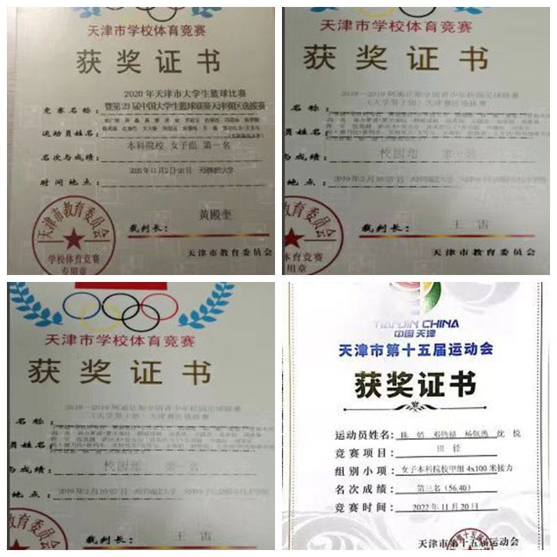 学校设置了15支球队,参加天津市教委举办的各项大学生体育竞赛。近年来,我校运动代表队获得2019年男足代表队获得天津市大学生足球比赛(甲组)冠军,2020年女篮代表队获得天津市大学生篮球比赛(甲组)冠军;2021年女篮代表队获得天津市大学生篮球比赛(甲组)冠军;2023年男足代表队获得天津市大学生足球比赛(甲组)亚军;2024年男足代表队获得天津市大学生足球比赛(甲组)亚军;2024年男篮代表队获得天津市大学生篮球比赛(甲组)季军。