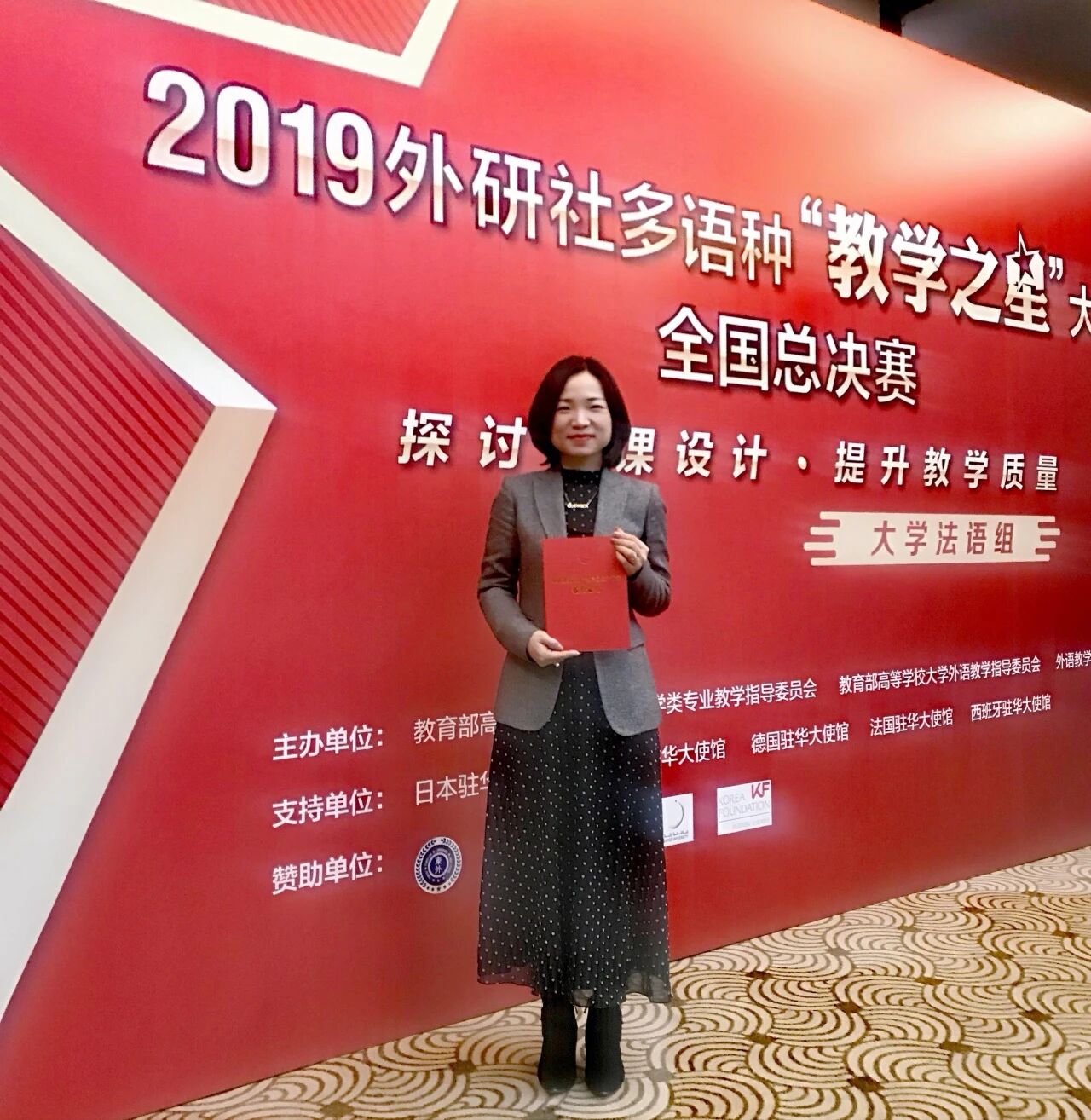 图1 学院教师巩佳芳获得2019外研社多语种“教学之星”大赛全国总决赛一等奖