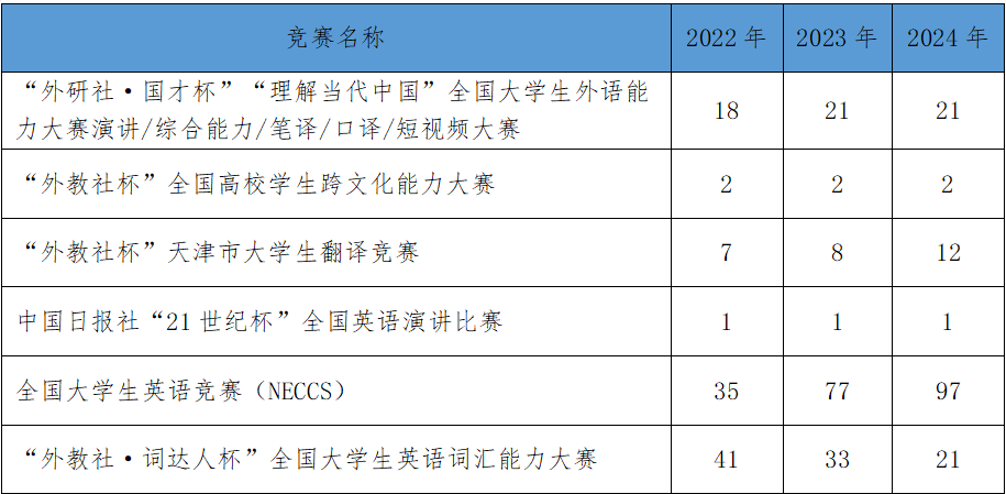 学院坚持“以赛代练、以赛促教、以赛促建、以赛育人”的理念,将竞赛作为促进教学改革、提高人才培养质量的重要抓手。2025年,学院成立外语竞赛中心,整合优秀教师资源,深入推进各级各类外语学科竞赛的组织和学生指导工作。近年来,学院学生在“外研社·国才杯”“理解当代中国”全国大学生外语能力大赛、天津市外语学科竞赛等外语类竞赛中获得市级及以上荣誉90余项,显著提升了学生的跨文化交际及外语实际应用能力。