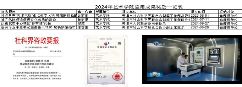智库资政建言。4篇研究报告获省部级以上领导批示,4篇被省级以上部门采纳;组织师生团队深入社区开展科普活动,惠及群众超1000人次,助力基层治理创新。与河西区政务服务中心开展设计类专业教学科研专题研讨,持续深耕科研,推动设计教育高质量发展。近三年与20余家企业开展横向项目合作,实现专利转化,服务地方产业需求。