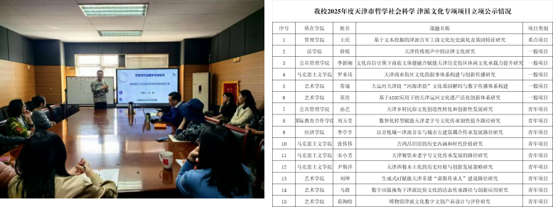 项目申报立项。在2025年天津市哲学社科津派文化专项项目申报中立项5项,成为此项立项最多学院。