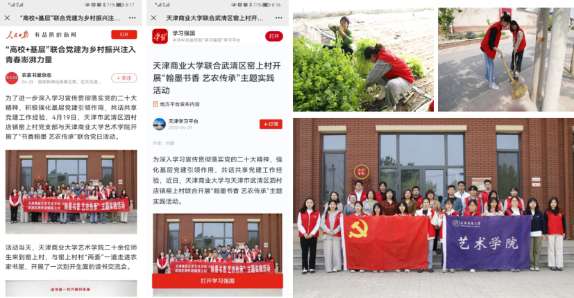 借助专业,积极开展社会服务。打造《永不消逝的电波》《剪纸寄初心》等红色微视频,学院公众号开设“声临其境”党建专栏,传播正能量;联合武清区窑上村开展“翰墨书香,艺农传承”主题实践,乡间田野开展劳动实践教育,为乡村振兴注入青春澎湃力量,获人民日报、学习强国等媒体报道;与南开区万兴街道合作开展“艺润春辉、善艺同行”社区爱心拍卖会,绘画专业学生作品拍卖所得用于慰问高龄老人;庄雪阳老师受邀创作的中国画长卷《和合之美》在中南合作共建的绿色科技孔子学院揭牌仪式上展示并被永久收藏,该孔院项目被列入习近平总书记对南非国事访问成果清单。另受邀参加第十一次全国华侨侨眷代表大会,并被评为全国华侨侨眷先进个人。