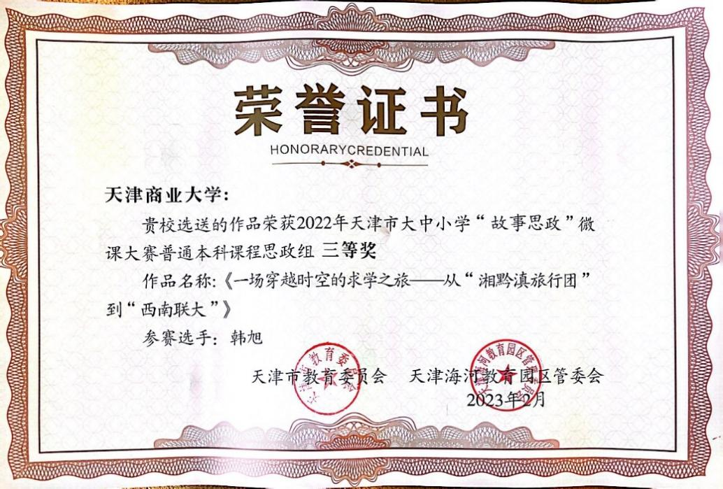 天津市大中小学“故事思政”微课大赛普通本科课程思政组三等奖